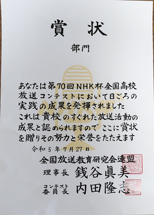 第71回NHK杯全国高校放送コンテスト 神奈川県大会・朗読部門 5位入賞 優秀賞 第71回NHK杯全国高校放送コンテスト 全国大会出場 準々決勝 強化合宿実施 R6年度 本校PR動画を企画制作作成 第39回神奈川県高等学校総合文化祭放送情報部門大会 奨励賞 栄区児童生徒スポーツ文化活動表彰(上記全国大会出場を評価) 神奈川県教育委員会 児童・生徒表彰 本校電話自動応答収録 |