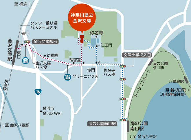 2. 東口を出て右手のアーケードを通り、銀行(三井住友銀行)を左手にしながら進むと、信号(金沢文庫駅前)が見えます。 |