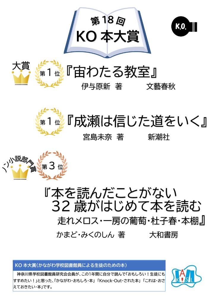 “KO本”とは「かながわ・おもしろ・本」 「Knock・Out・された本」 「これは・おさえておきたい・本」。 会員が、この1年間に自分で読んで「おもしろい!生徒にもすすめたい!」と思った本です。