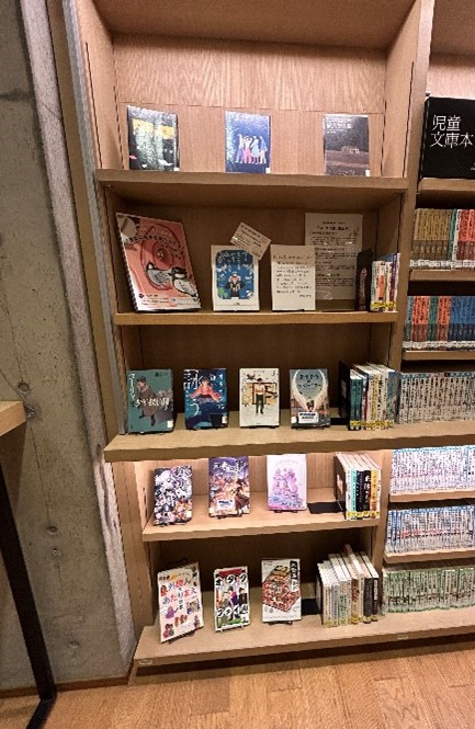 2館とも受賞作のほとんどが貸出中という状況のため、1冊本を中心に展示しています。 大賞本は表紙コピーで対応。リストも置いています。