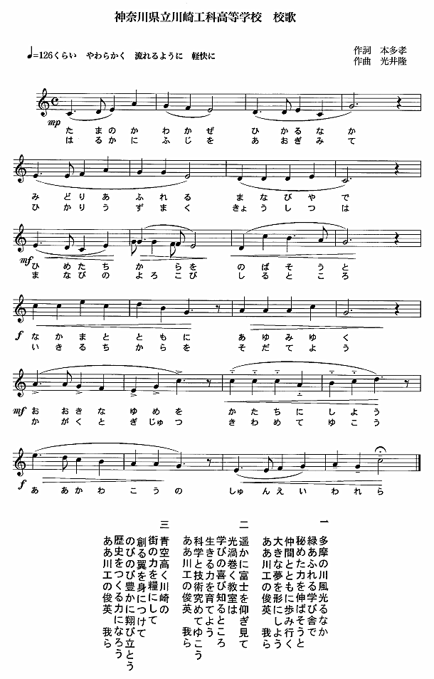 作詞については、3年間の川工での学びの中で、生徒諸君がそれぞれの潜在能力をさまざまな方面で伸ばそうという気持ちを声に出してもらおうと思いました。また、授業や行事、部活で仲間と仲間の豊かな関係の中で輝いて欲しいと言葉にしました。言葉は日常の言い方を大切にしました。自分たちの言葉として高らかにうたって欲しいと思います。文語体ではありません。作曲の方は歌い易さを第一に考えました。音域が広がらないメロディーに、若者たちに人気のある曲のコード進行をベースにしました。