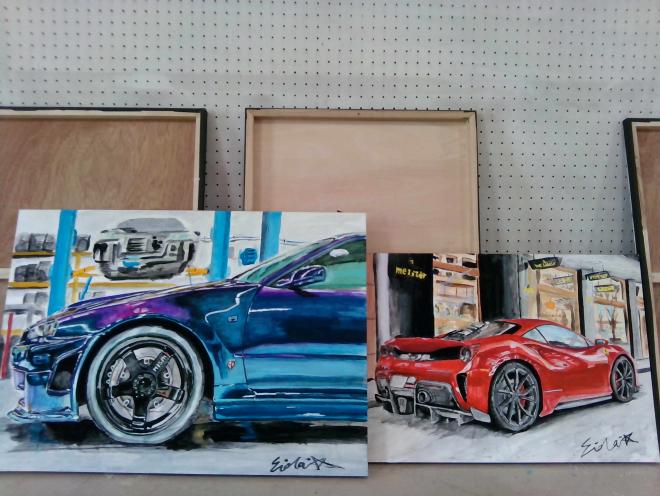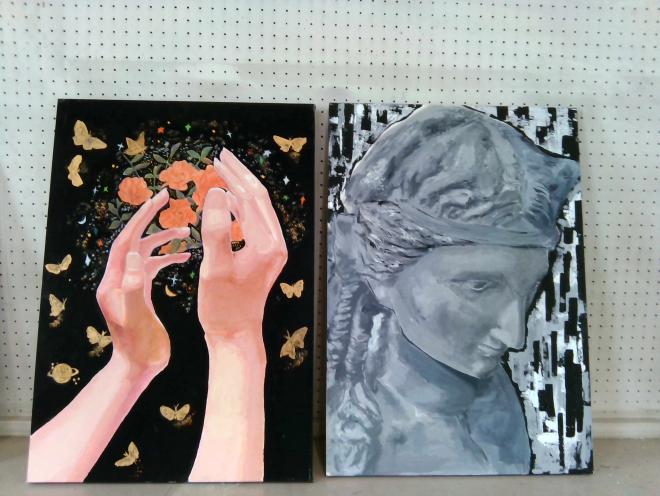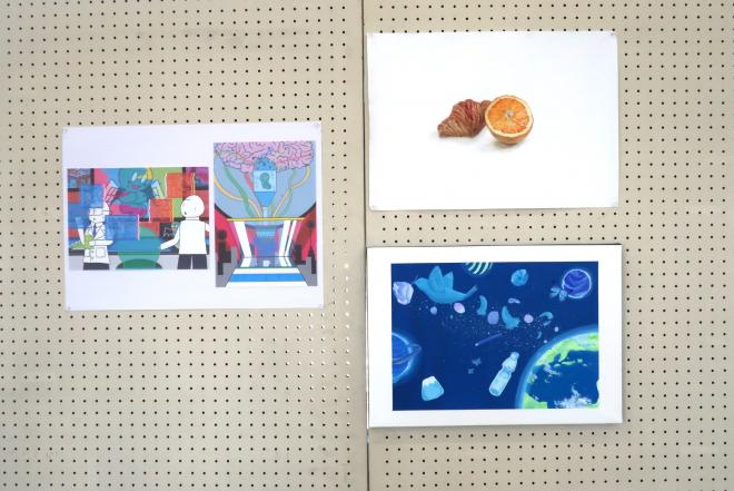 美術部では、絵画やイラストなど部員各自が自由に内容を考え活動しています。作品は文化祭や高校美術展などで発表しています。