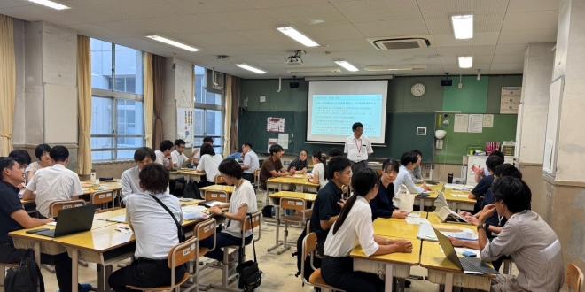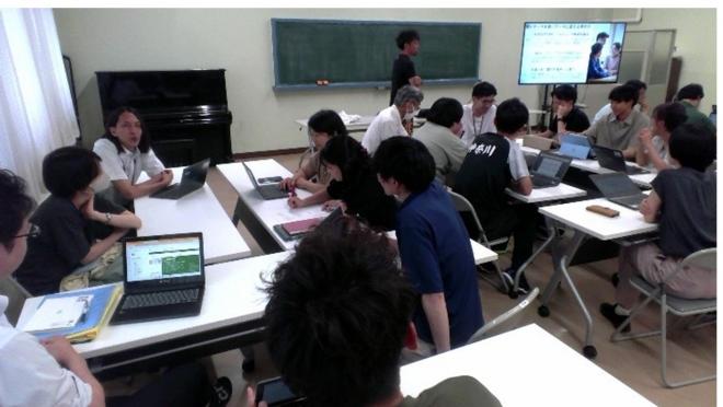 この授業は、ちょうど中堅教員研修の研究授業として実施している授業で、多くの教職員が訪れていました。