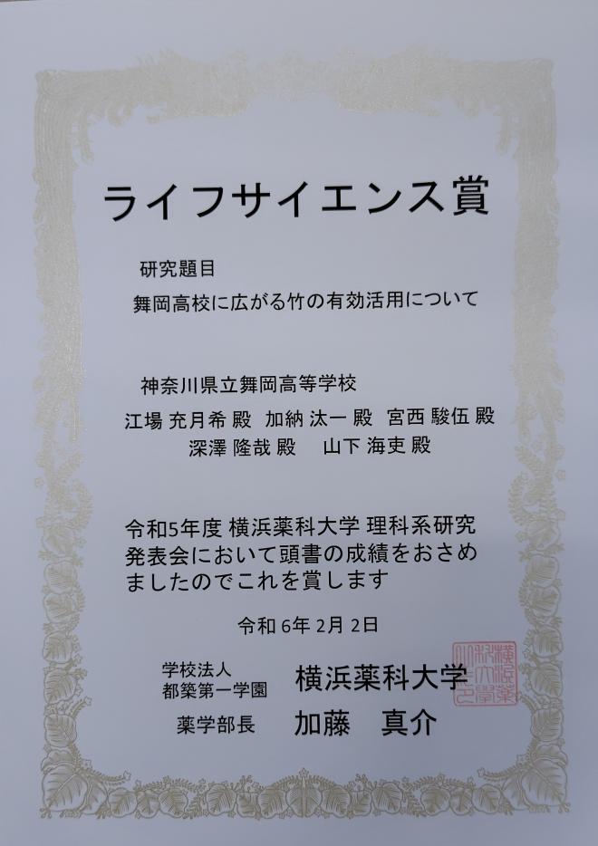 2024年2月2日に横浜薬科大学で行われた発表会において、「舞岡高校に広がる竹の有効活用について」というタイトルでポスター発表を行いました。