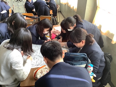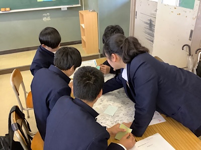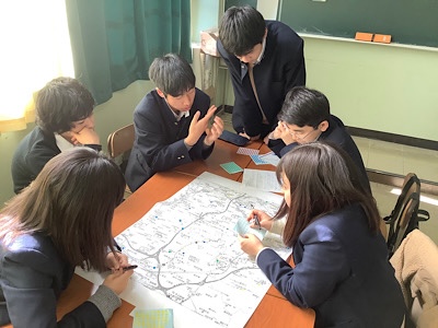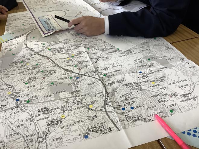 この訓練は、白地図やハザードマップ等の資料地図を用いて、支援が得られる施設や避けるべき危険区域がどこにあるのかをグループで相談しながら記入していき、本校周辺地域の状況や災害時の活動に役立つ知識を身につけ、防災意識を高める目的で行っています。