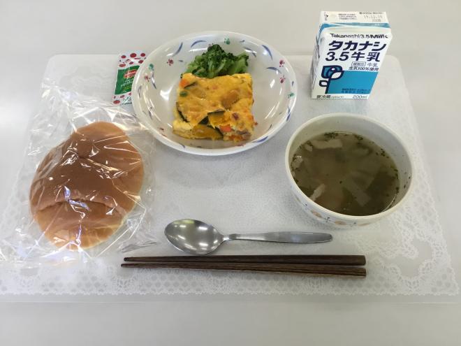 ロールパン 牛乳 パンプキンオムレツ ゆで野菜 コンソメスープ |