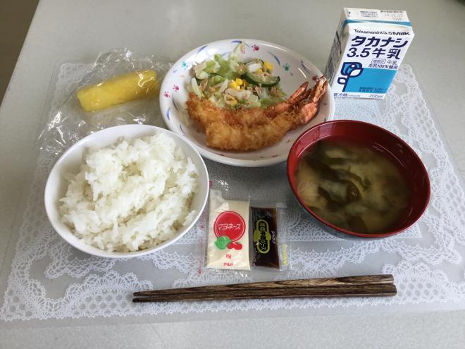 <分教室リクエストメニュー> ごはん 牛乳 エビフライ コーンとツナのサラダ 豆腐とわかめのみそ汁 パイン |
