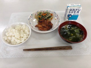 ごはん 牛乳 鶏肉の韓国風グリル 野菜のナムル わかめスープ |