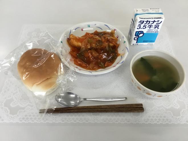 米粉ロールパン 牛乳 揚げ魚の甘酢あんかけ 卵スープ |