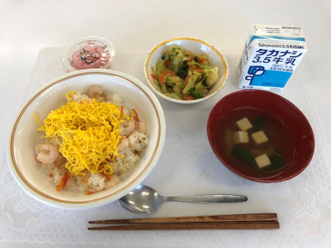 <桃の節句献立> ちらしずし 牛乳 菜の花のおひたし すまし汁 三色花ゼリー |