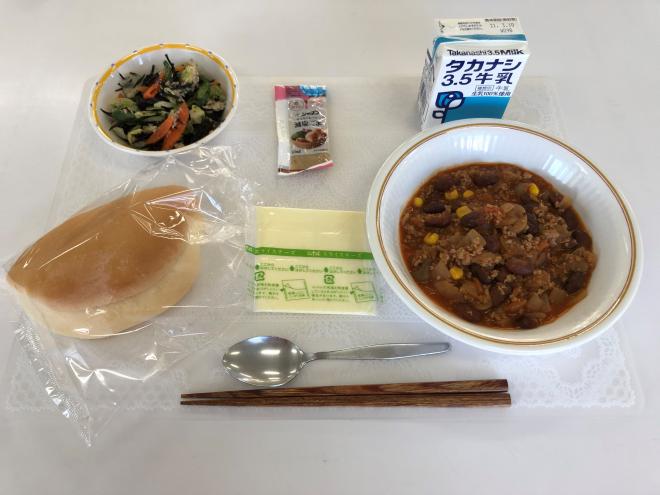 サンドパン 牛乳 スライスチーズ チリコンカン ひじきとささみのサラダ |