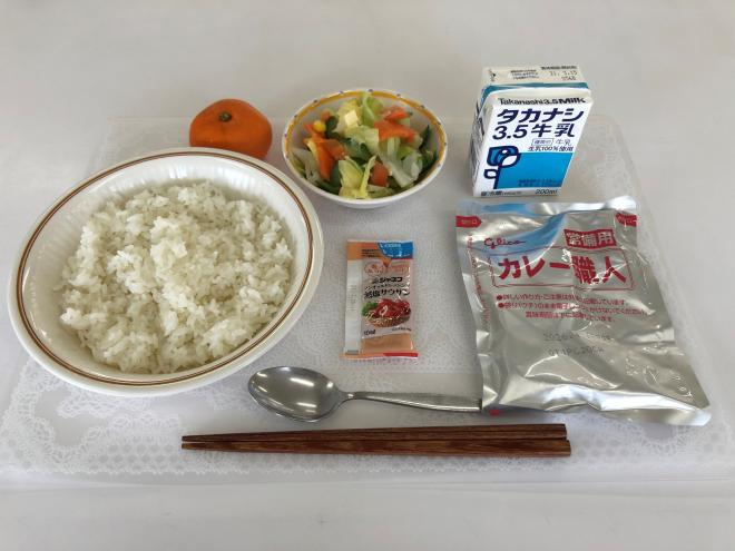 <防災対策献立> ごはん 牛乳 レトルトカレー チーズサラダ みかん |