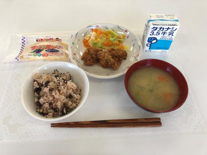 <高A3&高B3‐3リクエストメニュー> 赤飯 牛乳 鶏肉のから揚げ けんちん汁 春野菜サラダ クレープ |