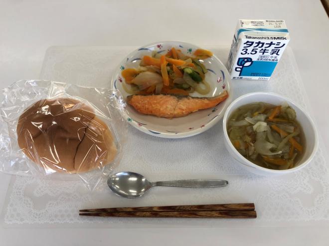 ロールパン 牛乳 鮭のムニエル にんじんとアスパラのソテー ジュリアンスープ |
