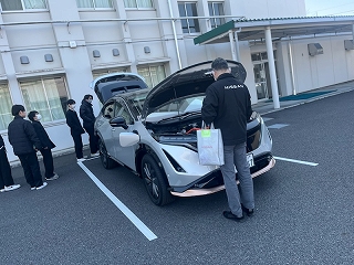 令和6年3月15日(金曜日)本校敷地内のメイクスペースにて、日産自動車関係の方々にお越しいただき、電気自動車や安全装置などの説明を受け、体験をしました。