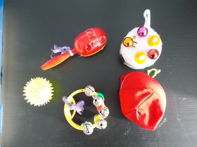 小学部では、うんどう(体育)は紅白帽、おんがくは鈴、おはなし(国数、生活など)は絵本、かんしょく(図工)は棘のあるボールというように、授業のシンボルとサインを学部で統一しています。手で触って、音で聞いて、目で見て、様々な実態の児童がいるからこそ、いろいろなやり方で伝わるように工夫しています。ずっと同じものを使っていく事で見通しが持ちやすくなり、シンボルを見ただけでサインをしたり期待で笑顔になったりする様子が見られます。