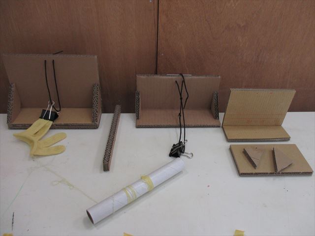 ダブルクリップを利用した自作発射台にマジックテープのついたボールを載せてフェルトの的に向かって発射させる。