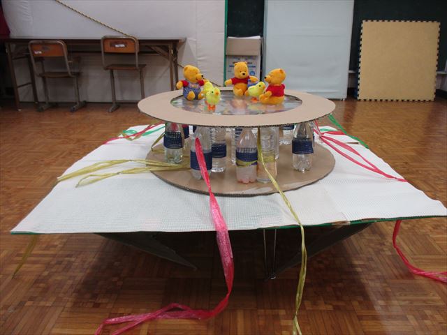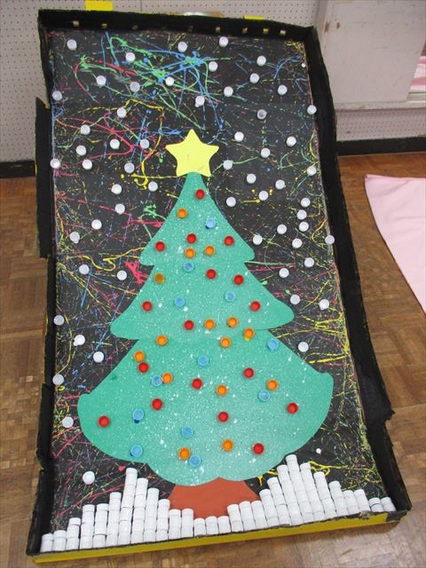 図工の授業で、ビー玉転がし絵で黒模造紙に模様とツリーを制作しました。その土台に雪とツリーの飾りに見立てたペットボトルキャップを貼りました。斜めにして置き、上部の穴からビー玉を落とすと、キャップにぶつかりながら、積もった雪に見立てたキャップの中に入ります。キャップに様々な色やキャラクターのシールを貼ることで、色によったお菓子が当たったり、キャラクターのシールをもらえたりする等、授業で使用しました。