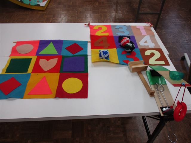 個別学習で、手指の巧緻性を高めるねらいで使用しました。少しかためのしっかりしたひもを使いました。