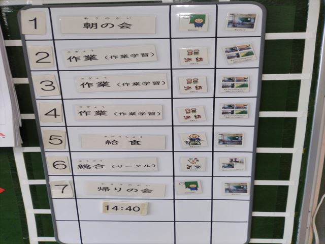 HRで使用するため作成しました。黒板に掲示できるように、授業等で黒板を使用する際には取り外すことができます。また日課表を見やすくするため、生徒になじみ深いイラストと場所の写真を作成しました。内容をわかりやすくしたことで生徒が見通しをもつことができました。