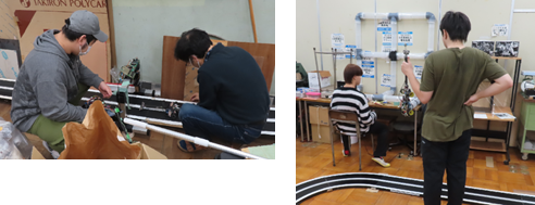 コンピューター部はマイコンカーの実演とメカモグラの体験を行いました。素人では分からない「超微調整」により正確にマイコンカーを走らせる技術を披露しました。また、メカモグラではモグラの関節やタイヤを「超微調整」し、スムーズにパイプ内を通す技術に歓声が上がりました。全国大会出場や世界大会出場権獲得の実力をいかんなく発揮しました。