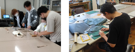 工芸部と有志はレザークラフト等の体験や販売を行いました。特にレザーのキーホルダーは大変な人気で、指南役の生徒たちが一生懸命キーホルダーの作り方を来校者に教える場面が印象的でした。工業高校らしく機械音や木づちの音が響く教室で、非常に良い経験ができました。