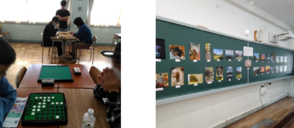 囲碁将棋オセロ同好会と写真部は3EのHR教室で共同展示及び囲碁将棋オセロを体験できるブースを作成しました。写真の作品が際立つように教室内はシンプルに、廊下は来校者の目に留まるようにカラフルな看板を設置し趣向を凝らした展示となりました。また、多くの方と囲碁将棋オセロの対戦をさせていただきありがとうございました。
