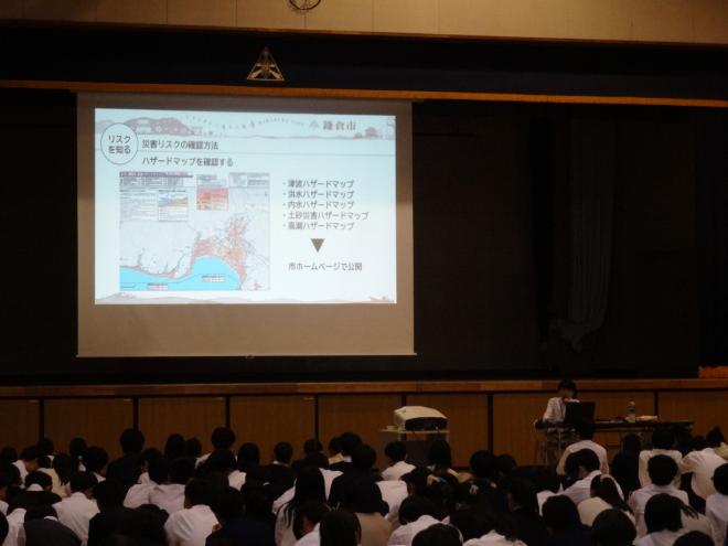 10月8日(火)7校時に、本校体育館にて2学年を対象に鎌倉市市民防災部総合防災課より髙橋良太様をお招きして講演いただきました。