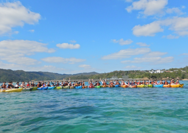 「マリンスポーツ」「マングローブカヤック」「もとぶ元気村で3種目体験(ドルフィンガイドツアー・クルージング・ジェルキャンドル作り)」「むら咲むらで文化体験(シーサー製作や海釣りなど)」「伊江島レンタサイクル」の5つの中で各自が選択したコースでの体験学習を行いました。