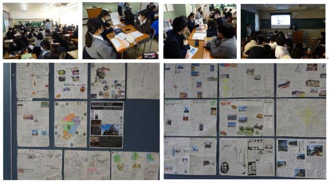 3、修学旅行の振り返りでは、事前に設定した自らの課題に沿った旅行先での体験や調査をもとに、研究発表を行いました。九州各地の歴史・グルメ・特産品や観光名所など、各地の魅力を写真やきれいなイラストなどで紹介していました。各クラスで特に優秀な発表は西棟2階ピロティ―で掲示されています。