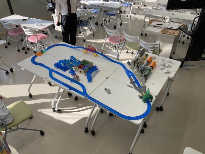 テーマは「スマートプラレールの開発」として、市販のプラレールと「レゴマインドストーム」を組み合わせた自動制御機能を開発しています。
