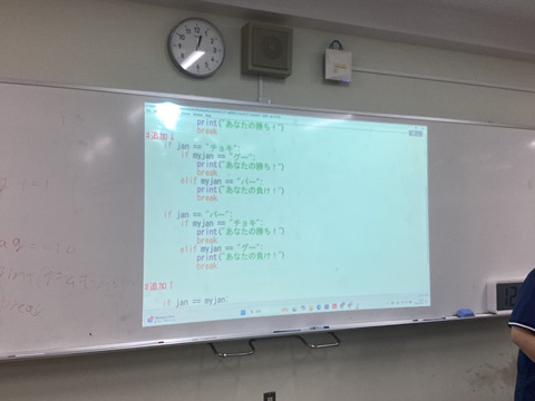 3年次のプログラミング発展の授業では、DXハイスクールで整備された高機能ノートパソコンを活用しています。Pythonで、じゃんけんゲームの開発をしています。