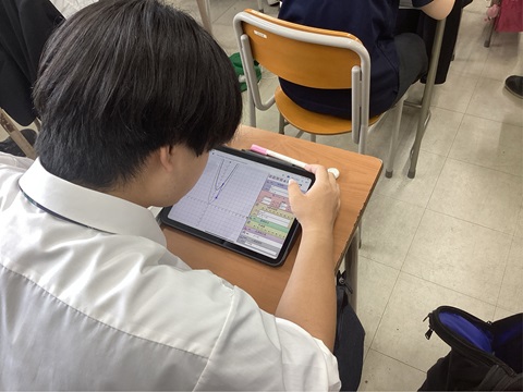 1年次の数学 Iの授業では、2次関数のグラフの理解を深めるために、関数グラフソフトGRAPESを活用し、かけたグラフはスクリーンショットをして、Googleスライドに貼り付け、全体で共有しました。