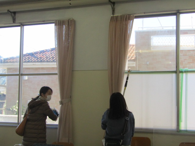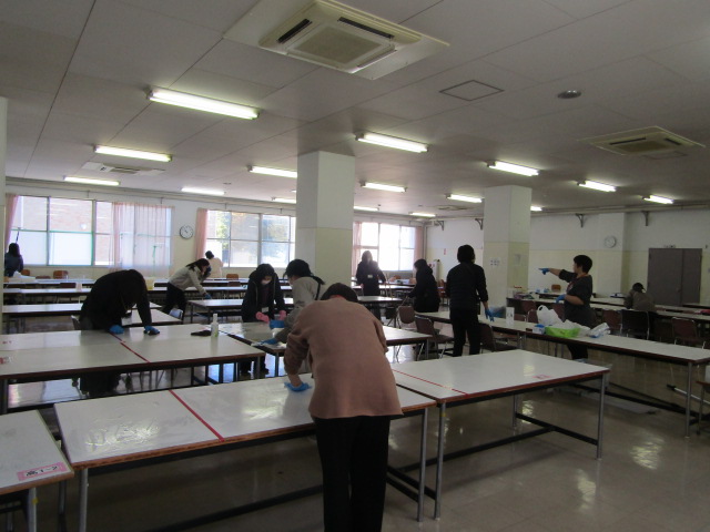 12月23日(月)PTAサポーター活動④「校内清掃」がありました。10名以上の保護者の方と教員とで、体育館につながる階段と食堂の大掃除!食缶をおくことで黒ずんでしまったテーブルをメラミンスポンジで磨き、普段掃除できない窓も、道具を使ってキレイにしていただきました。清掃終了後の食堂は、床もテーブルも窓もピカピカでした。皆様ご協力ありがとうございました。