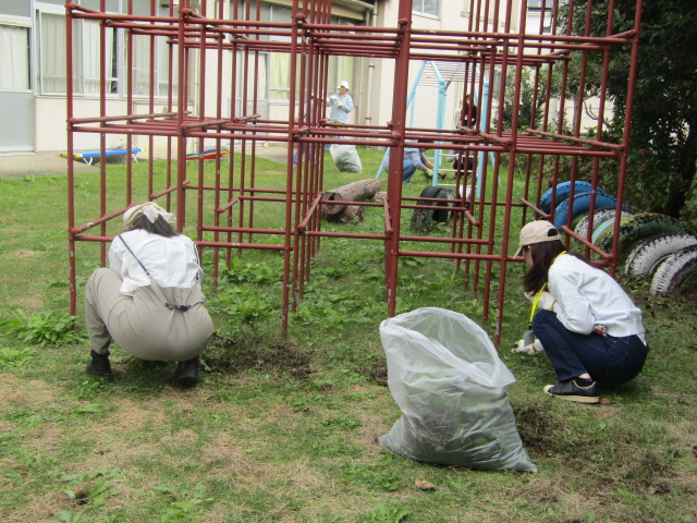 今回のPTAサポーター活動には、たくさんの保護者の方にご参加いただきました。保護者の方と教職員が一緒になって、グラウンドと中庭で草をむしったり柵に絡まった蔦を取ったりしました。