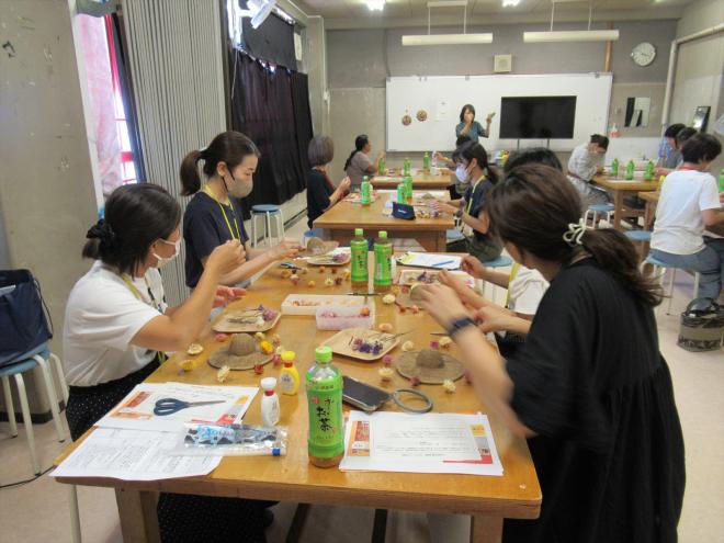 9 月 10 日(火)に、PTA研修活動「余暇活動体験」が開催されました。園芸療法士の柴沼敦子氏、NPO 法人いごこちよか代表理事の藤田由美子氏に講師として来ていただき、「障害児 の余暇活動について考えよう」をテーマに、①ワークショップ「植物に触れる癒しのひととき~花 咲く帽子の贈り物」②講話「障害児の余暇活動について」の2本立てで研修活動を行いました。