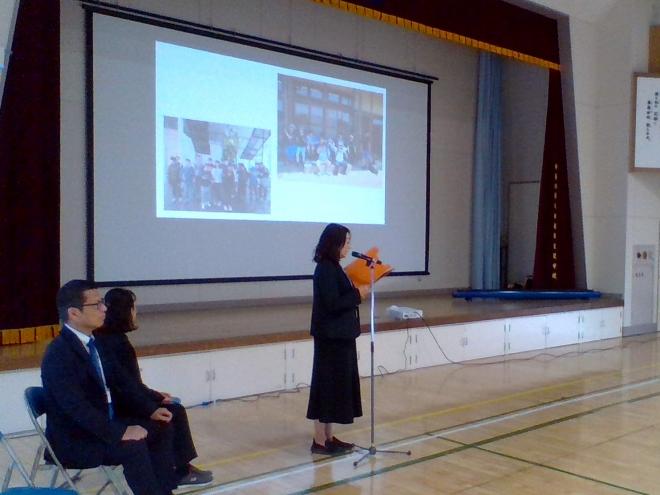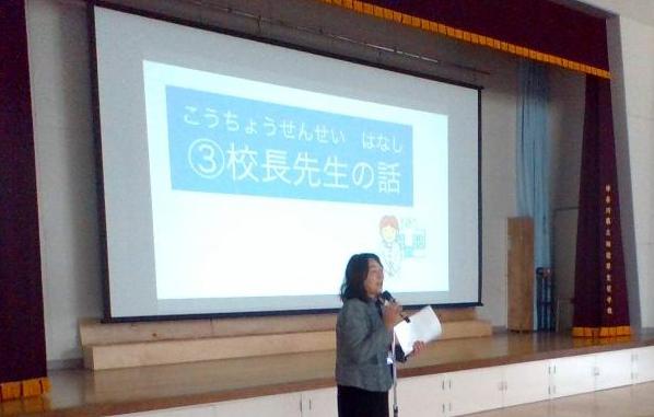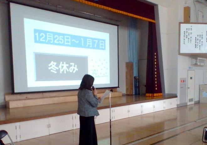 校長先生からは2学期の行事のふりかえりと、冬休みの過ごし方等の話がありました。校外学習、修学旅行、遠足、ハロウィンパーティー・・写真で紹介してくれました。