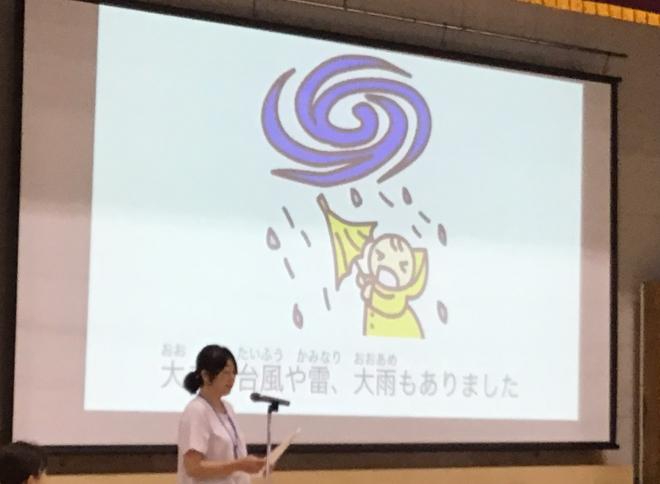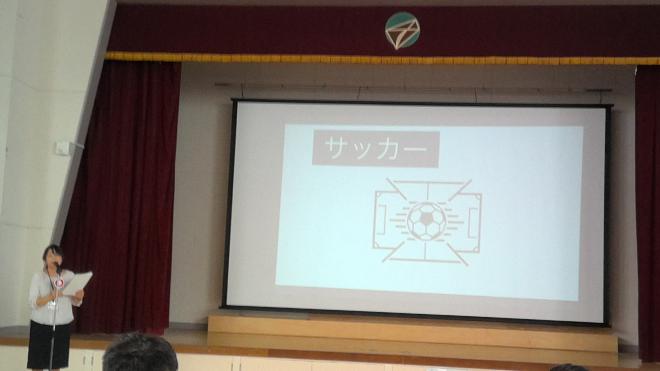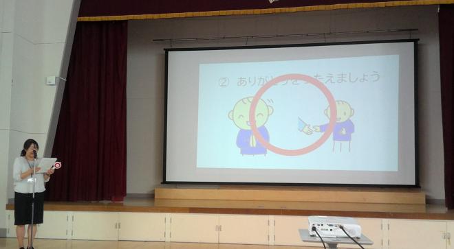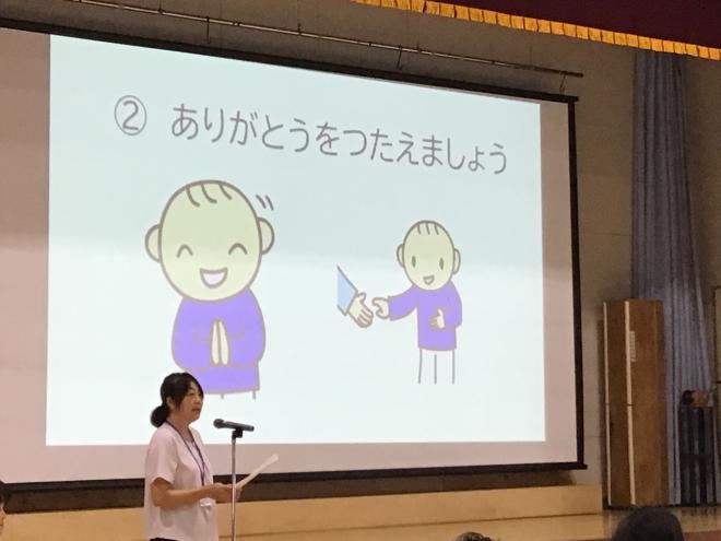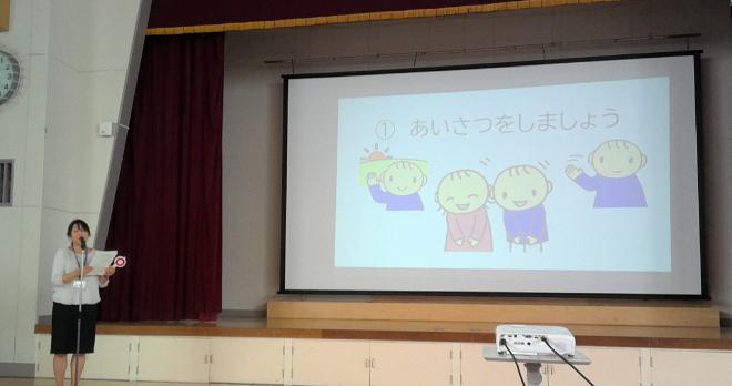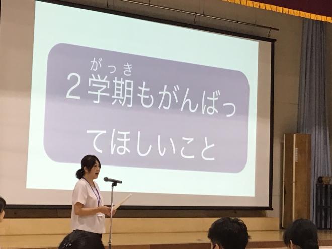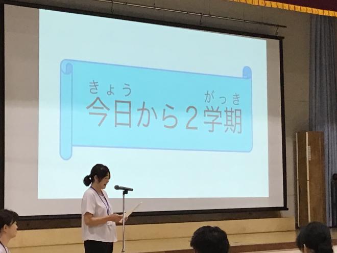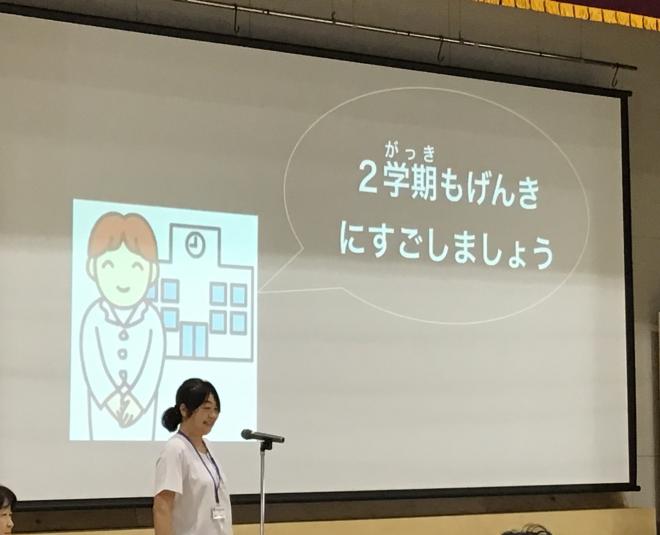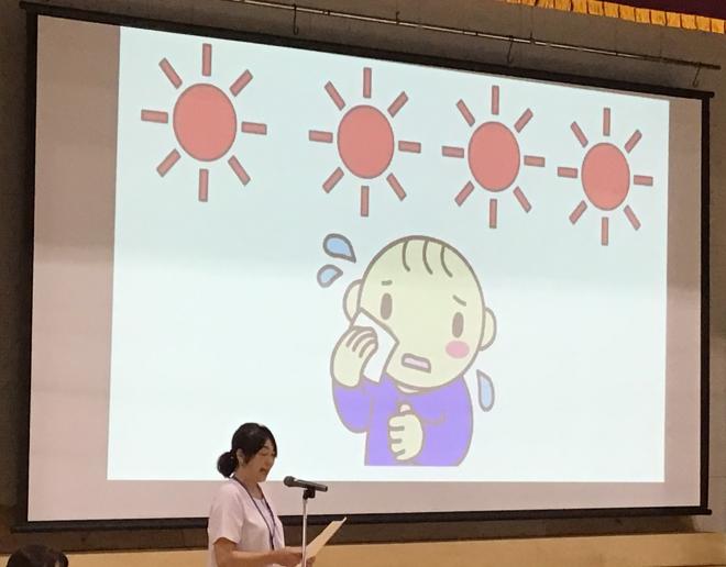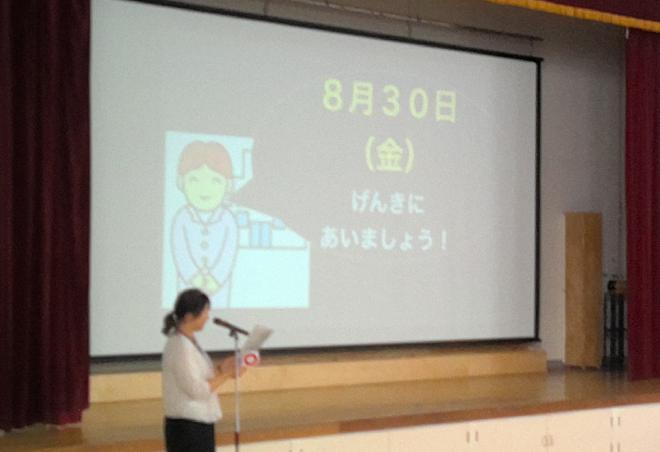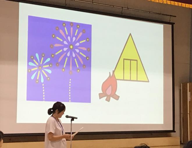 夏休みは「規則正しい生活をしましょう」、「お手伝いをしましょう」、「熱中症に気をつけましょう」などスライドを交えながら分かりやすく話をしてくれました。長い夏休み、いろいろなことにチャレンジしましょう。