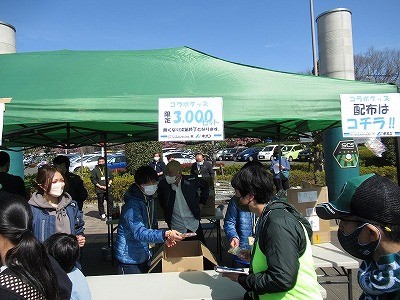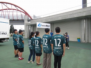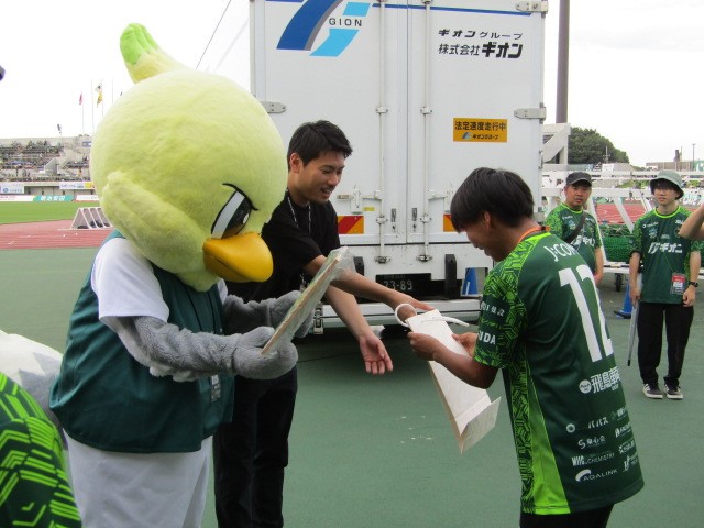 活動は、昨年度同様にフラッグベアラーとブースボランティアを展開し、ギオン社員の皆さんと配付方法等を確認しながら、サポーターポンチョを3,000枚来場者へ配付しました。また、選手へのメッセージを作成し、選手を代表してSC相模原の社長へ直接手渡しエールを送りました。