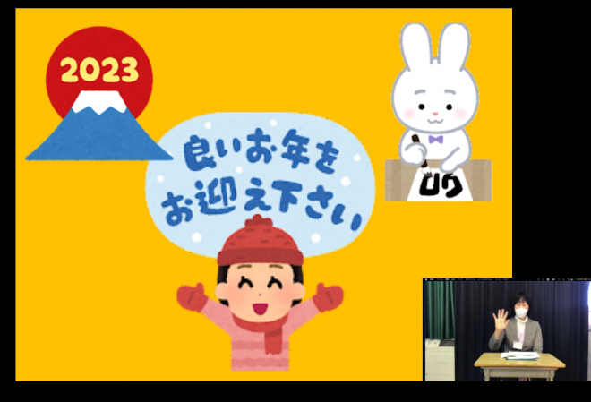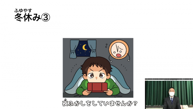 冬休みは、規則正しい生活をしよう。お手伝いをしよう。心がけましょう。1月8日にげんきに、あいましょう。よいお年をお迎えください。