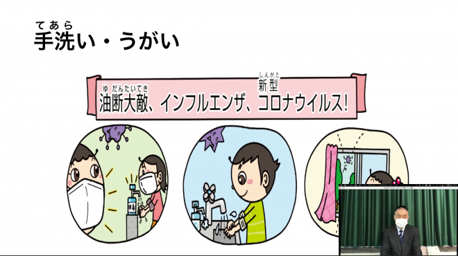 1学期終業式は、各教室にライブ配信を行いました。校長先生の話はスライドを交えて各教室へ・・・。