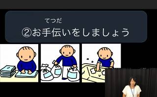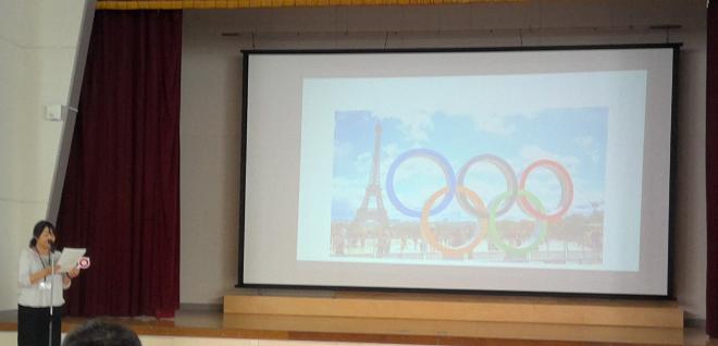 あいさつは出来ましたか?みなさん、よくできていました・・。ほめてくれました。もうすぐオリンピックが始まります。競技のピストグラムを当てるクイズをしてくれました。