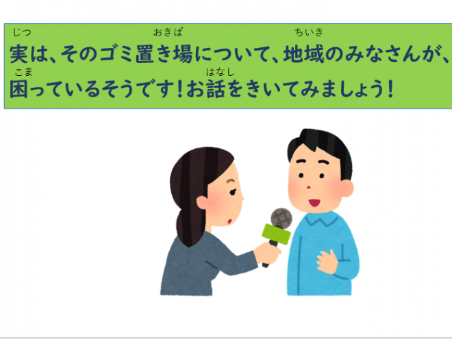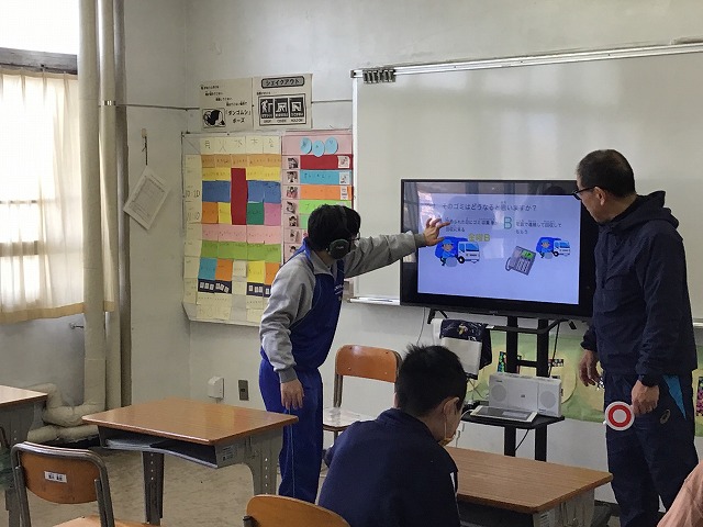 1月22日(月曜日)に、中学部の生徒が、自治会やまちづくりセンターの方々が見守る中、地域のゴミ置き場へポスターを設置しました。活動後、生徒の中には、ゴミがあると、「ゴミ」「ゴミ」と声をかけたり、分別して捨てたりと、ゴミに対して意識するようになりました。