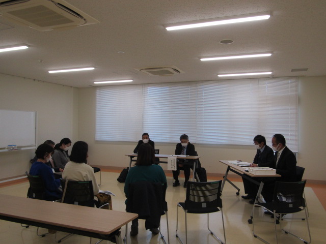 2月17日、宮城県立支援学校女川高等学園(創立7年目の知的障害教育部門の学校で、宮城県では唯一の全寮制の特別支援学校)の学校運営協議会の委員や先生、計4名の方が来校されました。県内の2校の特別支援学校を視察された後に来校し、校内を見学しました。その後、学校運営協議会の内容や高等学校との連携について意見交換を行いました。短い時間ではありましたが、本校のことを知っていただく良い機会になったと思います。