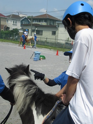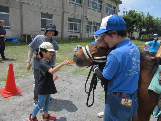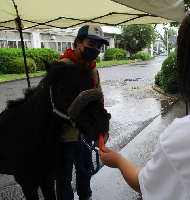 ヘルメットをかぶり乗馬すると高さや揺れにびっくりする児童・生徒がいましたが、グラウンドを2周するうちに慣れ、手を振り合ってたくさんの笑顔が見られました。乗馬のあとはスタッフさんから餌の人参スティックの持ち方を教えていただき餌やりやふれあいの時間になりました。尚、今回やってきてくれたポニーたち、相模原麻溝公園ふれあい動物広場で会えるそうです。
