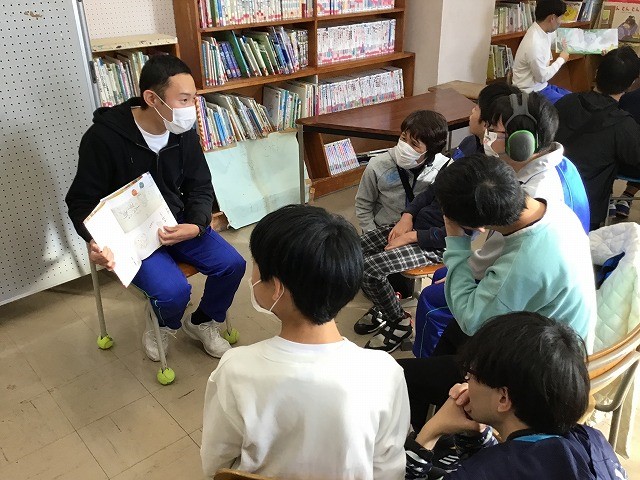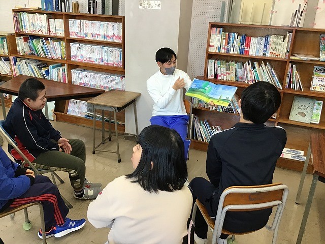 高等部3年生(5名)が、2グループに分かれて、中学部の生徒を対象に笑顔で明るい雰囲気を作りながら、ゆっくりとわかりやすいスピードで読んでいました。中学部の生徒たちは、とても楽しそうに読み手の顔や本を見ながら、話を聞いていました。