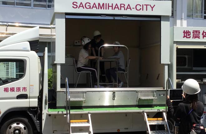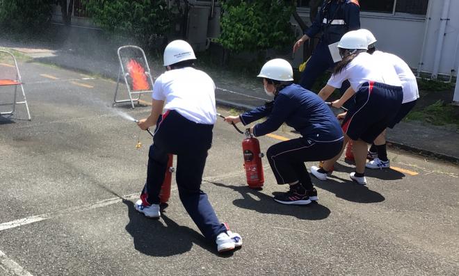訓練、地震発生・・・。調理室と食堂から出火しました・・・。ドキッとする放送の後は、安全にグラウンドと駐車場へ避難ができました。その後は、起震車体験や消火器の体験を行いました。真剣な表情で参加しました。