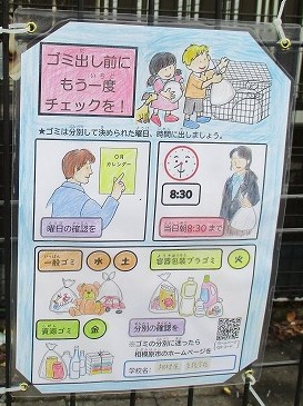 今後も、学校周辺のゴミ置き場を中心にポスターの掲示を増やす予定ですので、地域の皆様にご理解、ご協力をいただきながら、地域の一員として取り組んでいきたいと思います。
