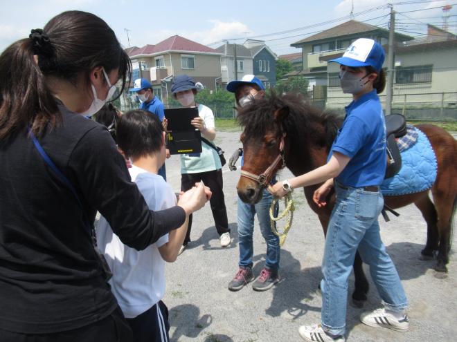 5月22日、ポニー4頭が学校にやってきました!晴天の下、かわいいポニーたちに児童生徒は興味しんしん。自信を持ってポニーにまたがる子、ちょっと不安で付き添ってくれる職員さんにしがみつく子、少し距離を持って眺める子。