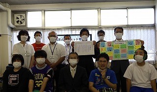 贈呈式後、関山社長と生徒代表の皆さん、会社・学校関係者の方々で記念写真を撮りました。